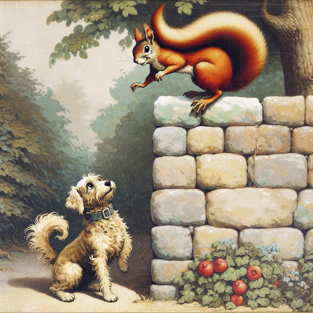 This image shows a squirrel playfully teasing a dog from atop a stone wall. The scene is rendered with vibrant colors and whimsical details in a matte painting style, reminiscent of classic storybook art.