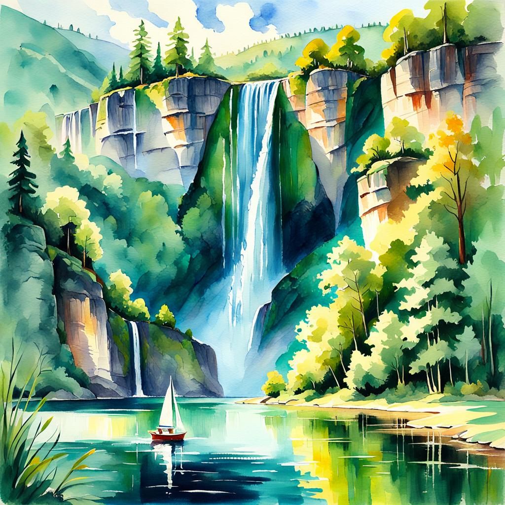 A watercolor sketch of a serene lake landscape featuring a small sailboat and a dramatic waterfall cascading down a lush cliffside. The artwork employs loose, expressive brushstrokes and vibrant colors.