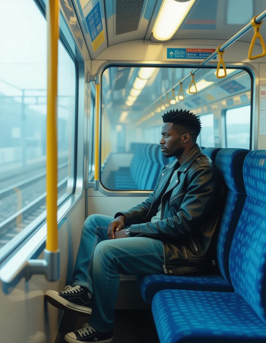 This image shows a man sitting on a Japanese bullet train, lost in thought as he gazes out the window. Soft lighting illuminates his face, emphasizing the mood of nostalgic melancholy in a photorealistic style.