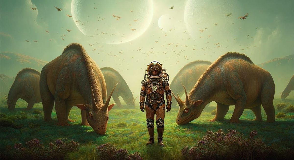 A striking picture of a steampunk astronaut observing reptilian creatures grazing under a vivid sky. The scene is rendered in a detailed, imaginative style.