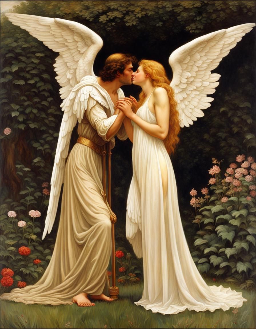 This image shows Lucifer kissing Eve in the Garden of Eden. The figures are rendered with realistic proportions, reminiscent of pre-Raphaelite paintings with dramatic historical themes.