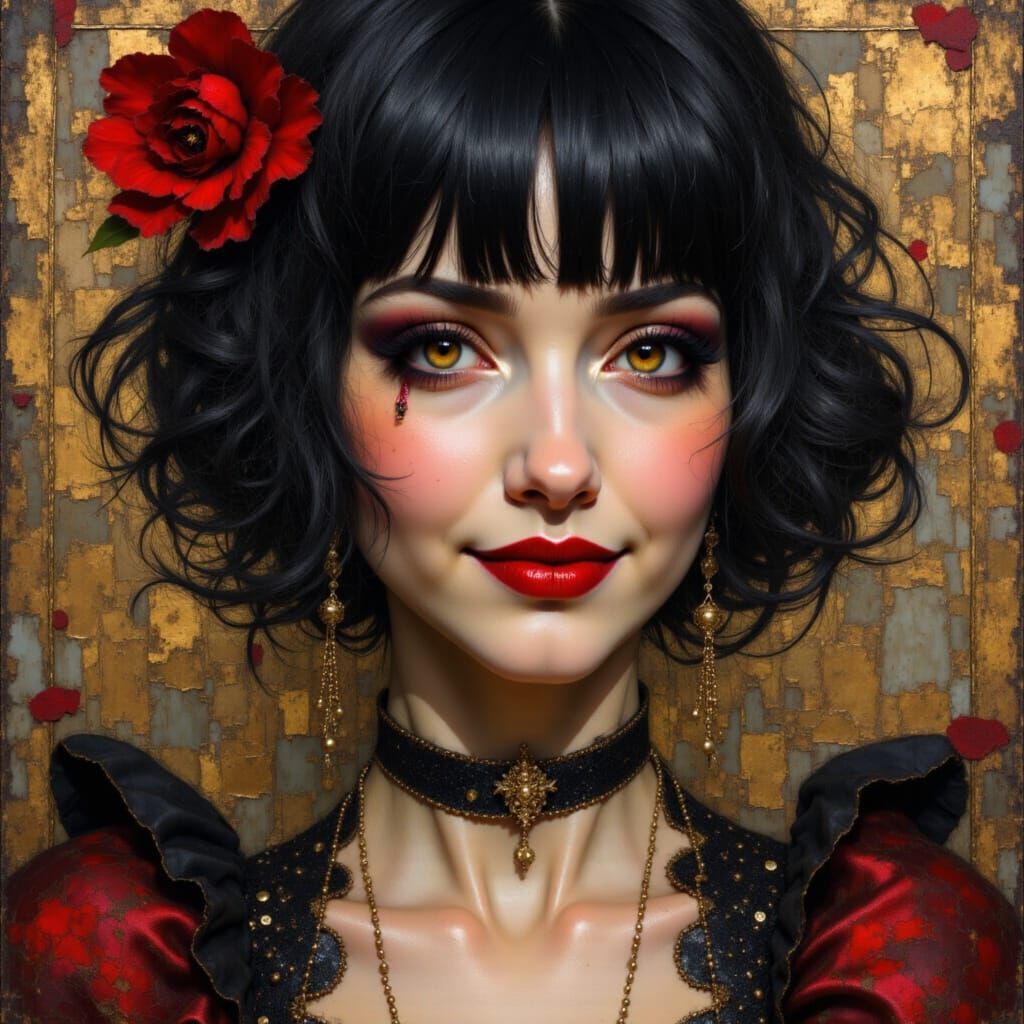A hyperdetailed portrait of a smiling punk queen with black hair, red lipstick and a dark red and gold dress. The image has a cinematic quality in a rococo art style.