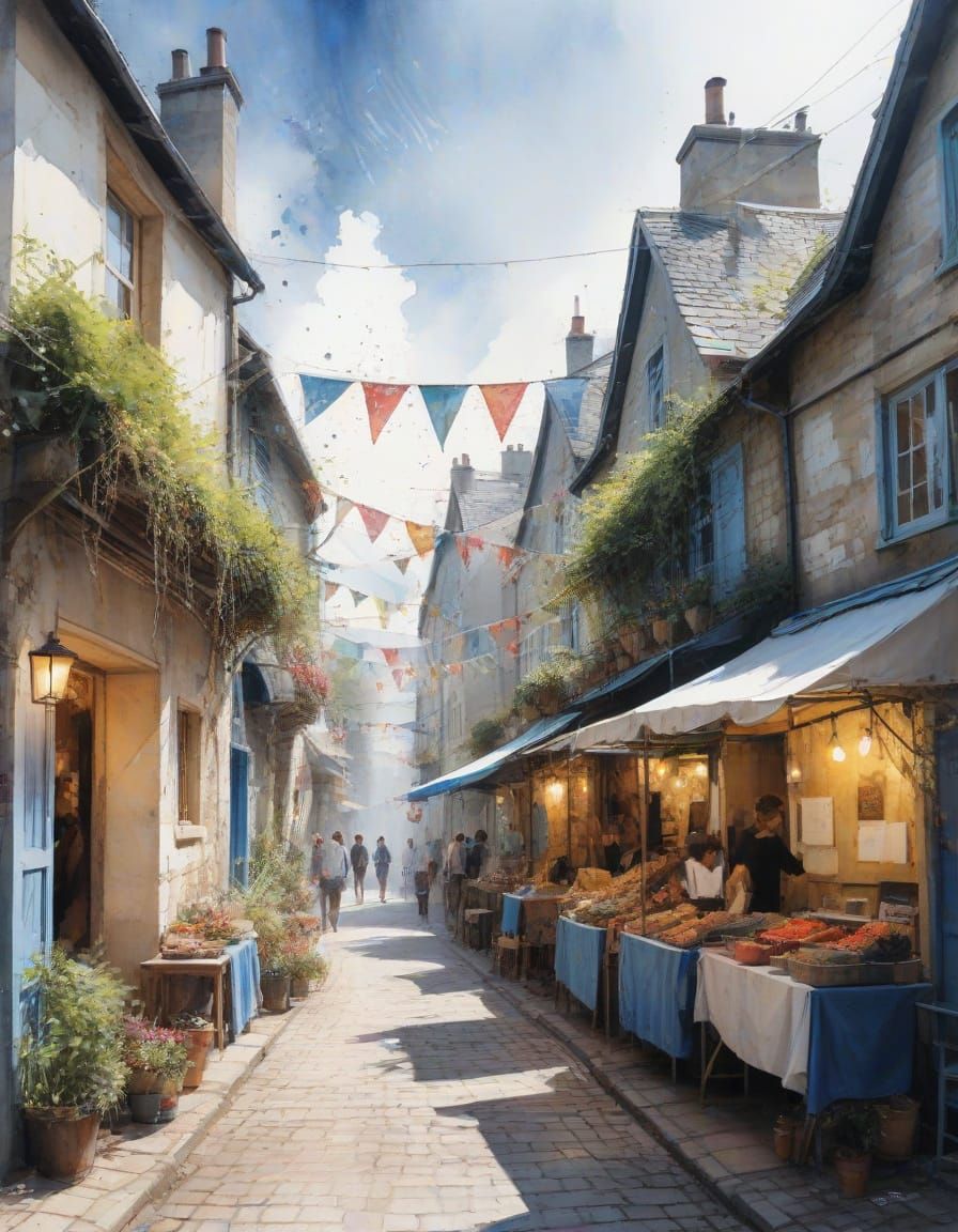 A vibrant scene of a summer festival in the countryside. A cobblestone street is lined with market stalls under a blue sky, in a watercolor style reminiscent of Carne Griffiths.