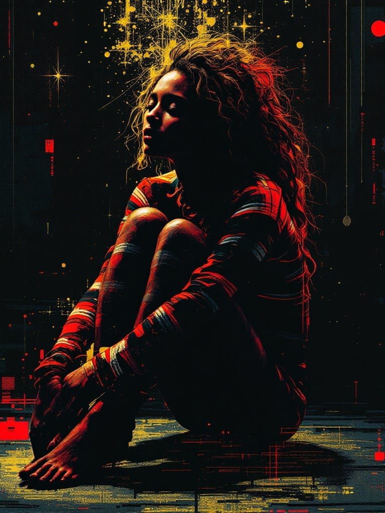 This vibrant digital artwork blends Rembrandt's dramatic lighting with Keith Haring's bold linework and modern glitch effects, creating a striking fusion of classical and contemporary styles.