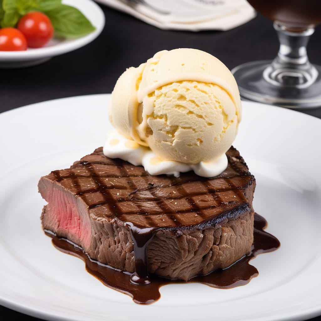 This image presents a surreal and unexpected pairing of creamy ice cream alongside a juicy ribeye steak. A curious visual exploration of contrasting food elements.