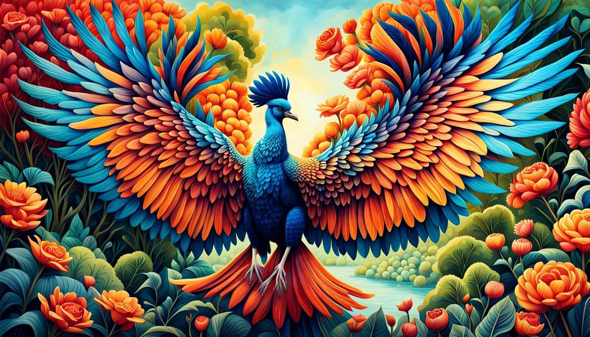 A digital illustration of a giant pūteketeke bird performing a mating dance in Central Park. The piece features intricate motifs and a beautiful composition with deep, rich colors.