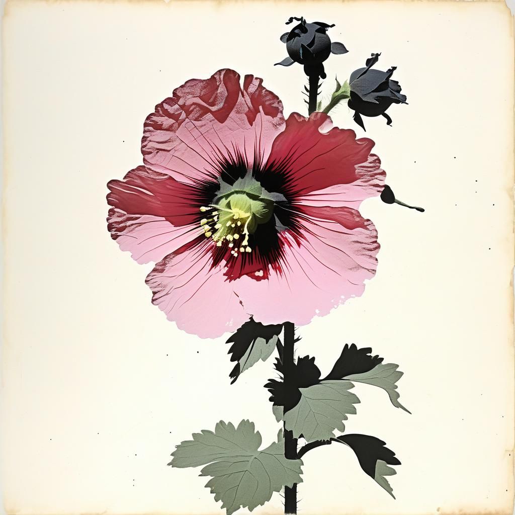 This image features a delicate hollyhock blossom, created in a style reminiscent of animated silhouette art and expressive ink drawings.