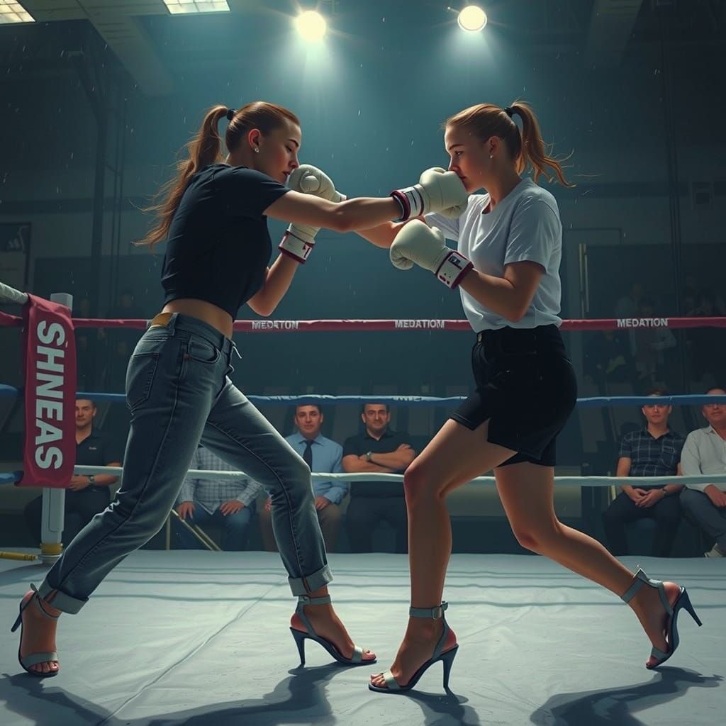 A hyper-realistic digital image captures the intense moment of a female boxer striking her opponent with precision, showcasing the physicality and athleticism of women in combat sports.