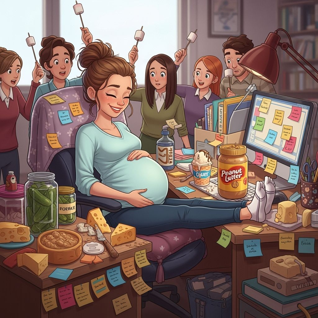 A pregnant woman smiles at her cluttered desk overflowing with food. Colleagues watch with amusement in this humorous digital painting with a realistic cartoon style.