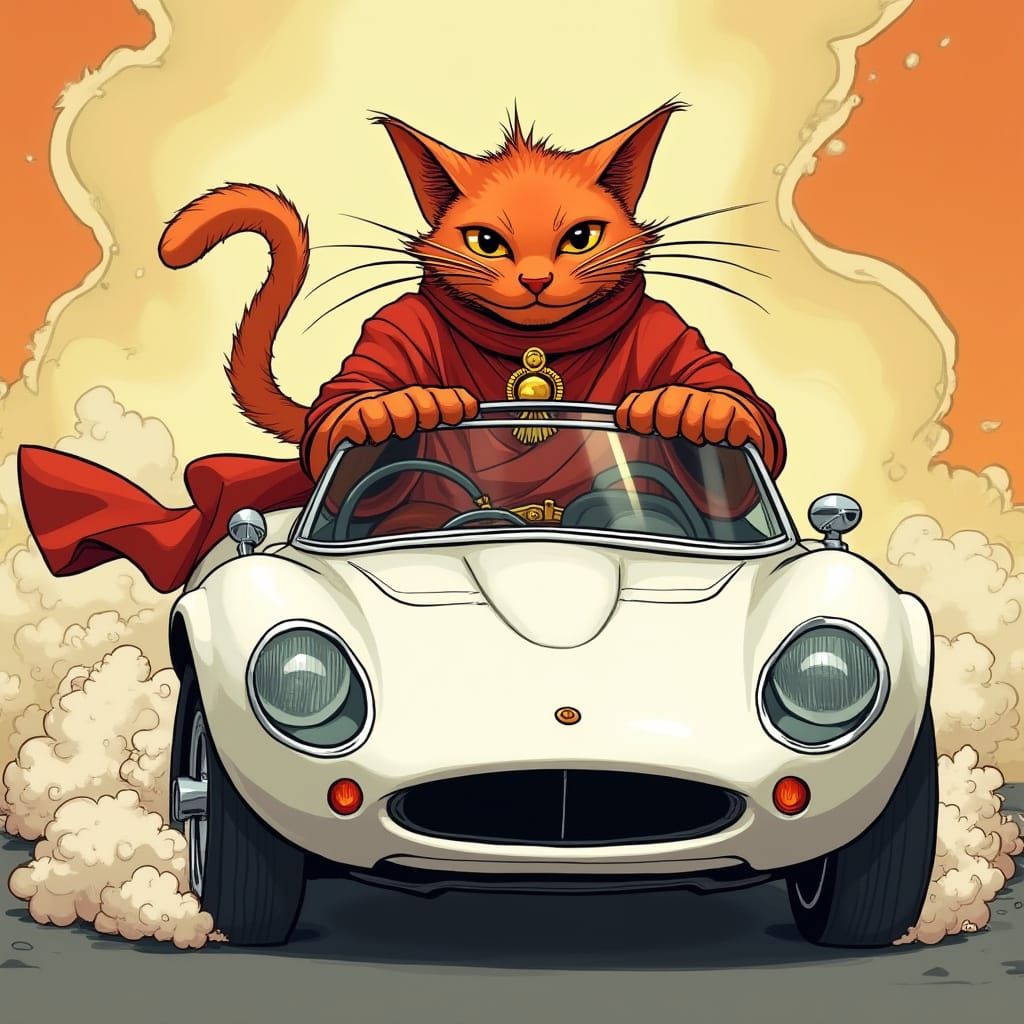 A red cat dressed as a Lama monk drives a white sports car. The image blends spiritual and feline elements in a vibrant graphic novel style, with bold lines and dynamic poses.