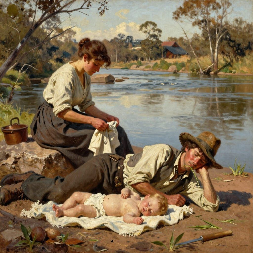 This historical oil painting depicts a colonial Australian family by a river. A woman washes clothes while a man rests nearby, watching their sleeping baby, in a warm, detailed style.