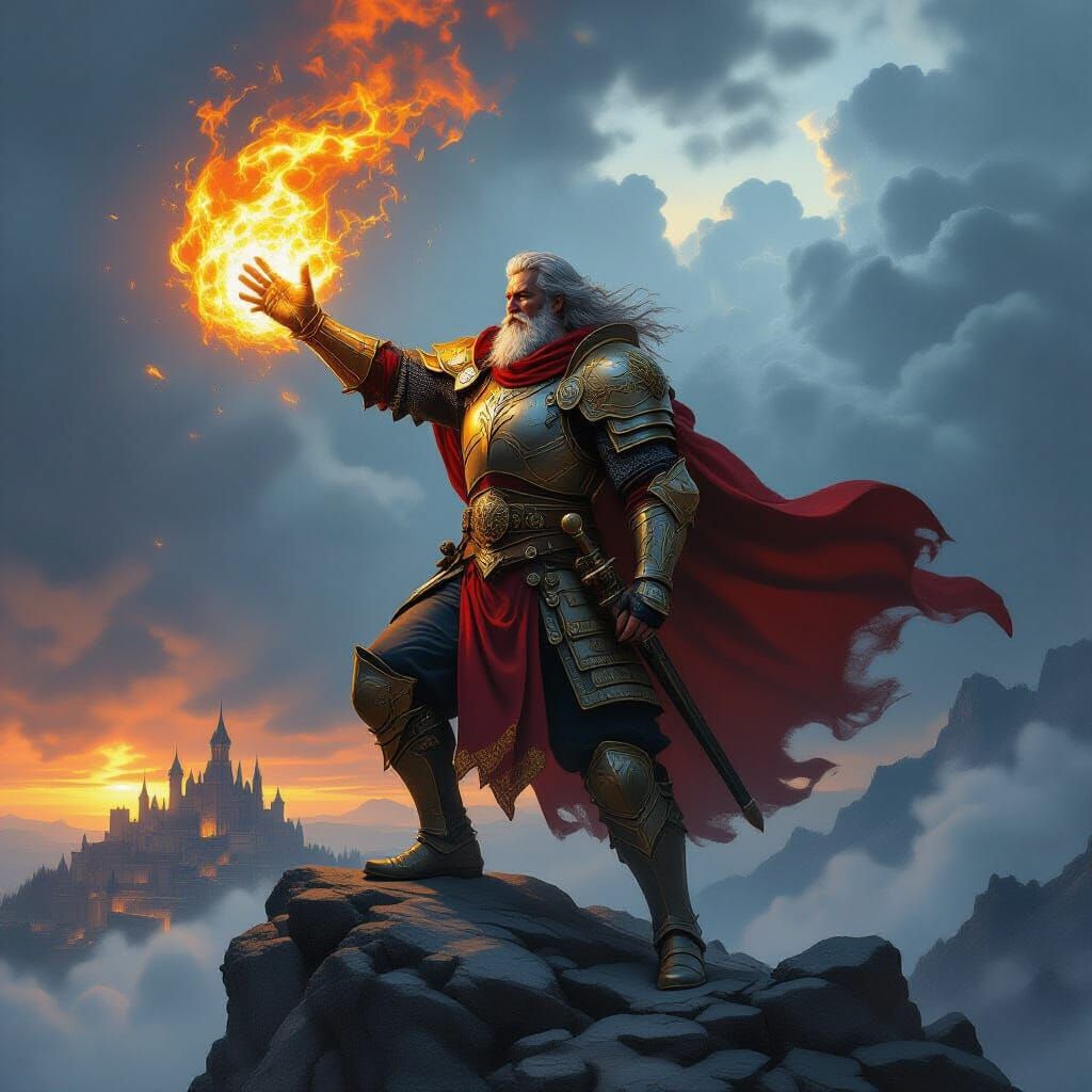 This hyperrealistic concept art depicts a stoic king on a mountain peak, summoning a fire tempest over his kingdom. Features dramatic lighting and a dynamic color palette.