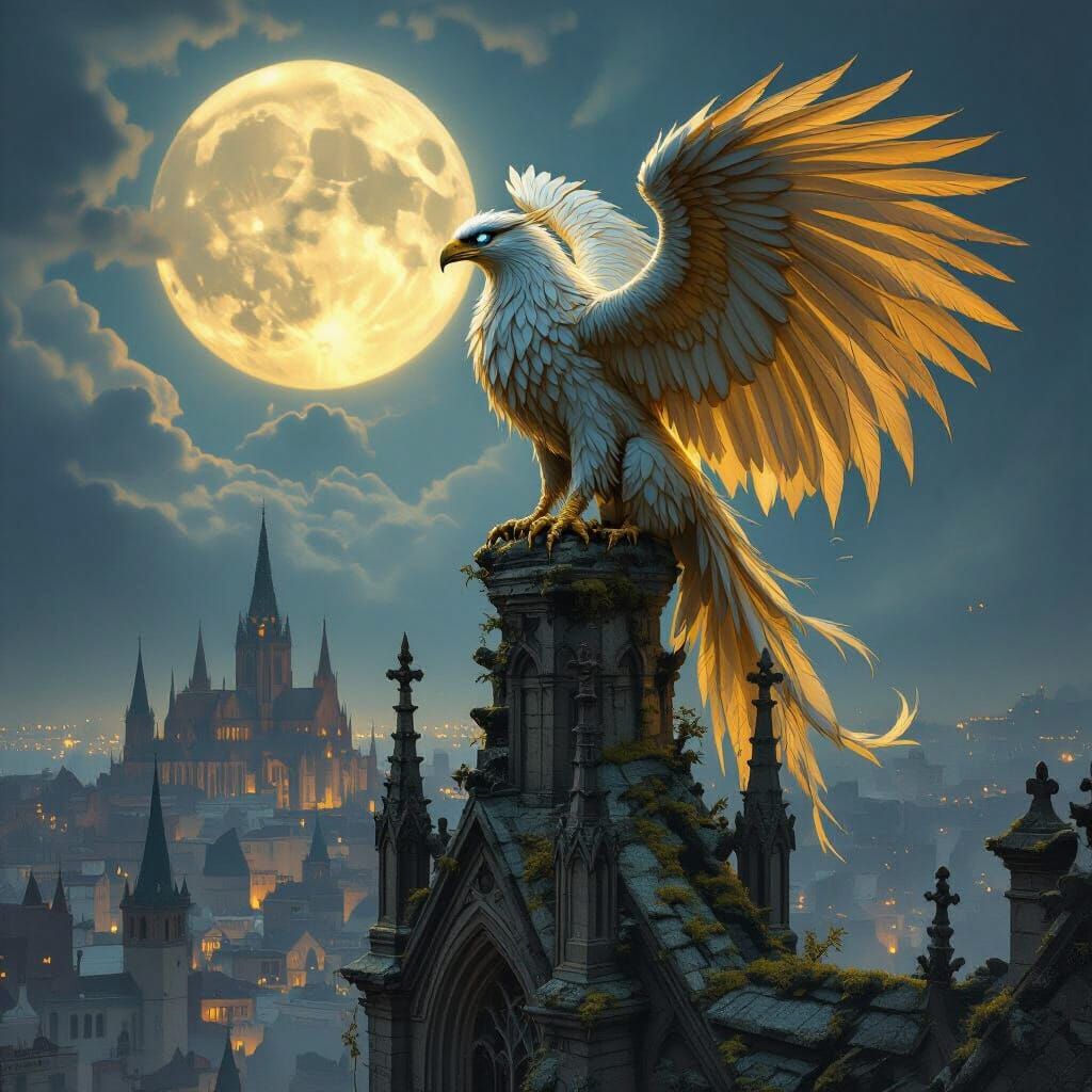 A majestic griffin with golden feathers and sapphire eyes sits atop a gothic cathedral. This image, reminiscent of dramatic Caravaggio paintings, features intricate details and a cinematic atmosphere.