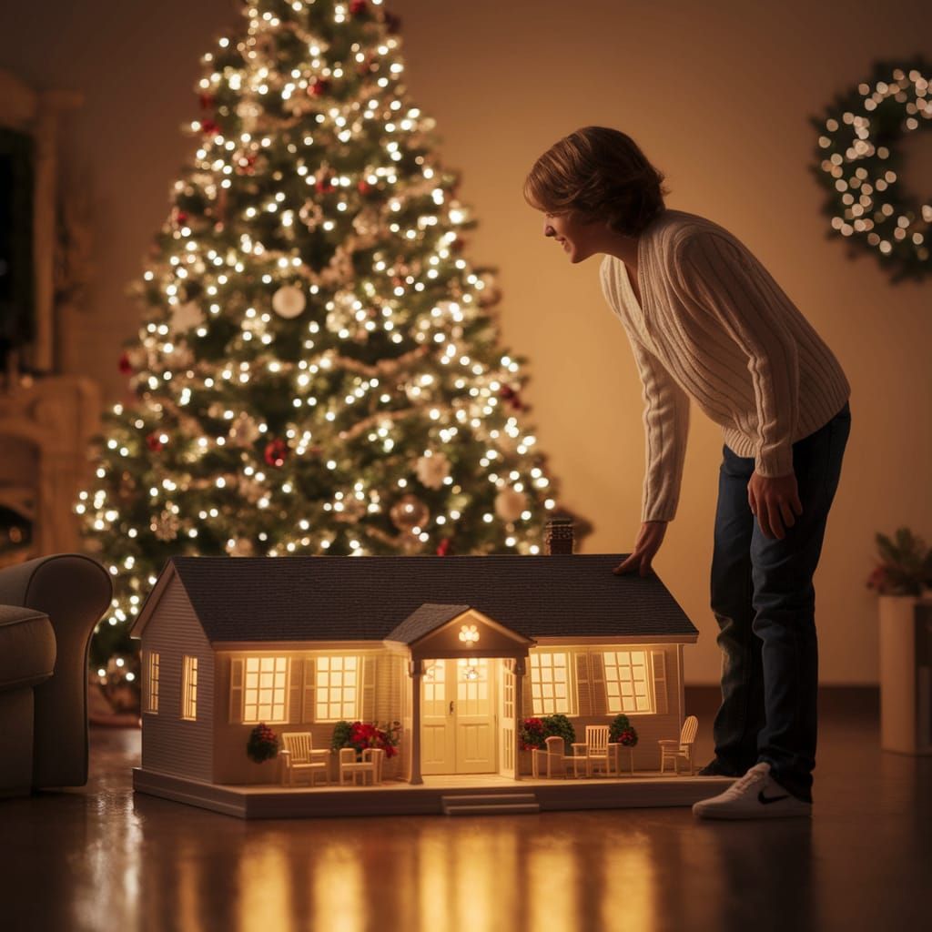 This heartwarming image captures a teenager's enchantment with a meticulously crafted miniature nursing home nestled beside a vibrant Christmas tree, bathed in the warm, inviting hues of the holiday season.