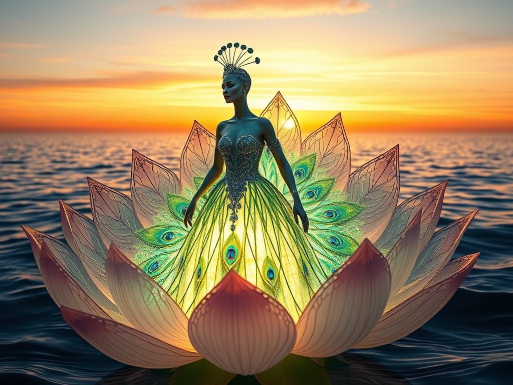 A striking picture of a peacock empress emerging from a glowing lotus. She stands in a solar gown shimmering with emerald and sapphire hues, in a cinematic and otherworldly style.