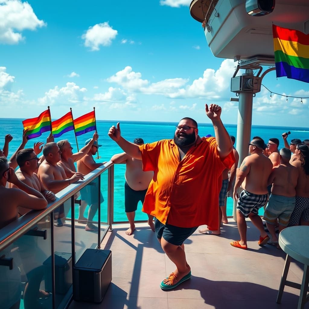 This image shows a joyful, plus-sized man dancing in an open-air club with pride flags, overlooking a turquoise ocean. The scene is lit with psychedelic lights and rendered in a hyper-realistic digital art style.