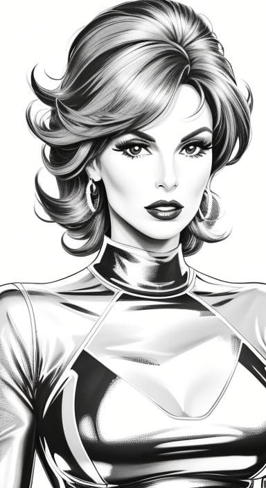 This image shows a close-up portrait in a graphic illustration style. The subject is Raquel Welch wearing a latex dress, featuring bold black lines, vivid lipstick, and glossy gunmetal grey textures.