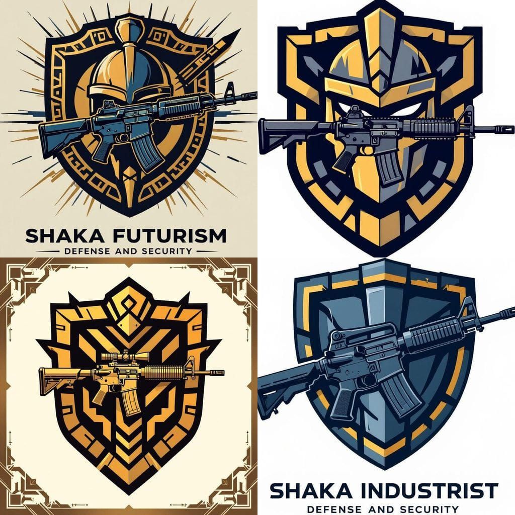 This image features an Afro-futurist corporate logo for Shaka Industries, incorporating shield and rifle elements, symbolizing defense and manufacturing.