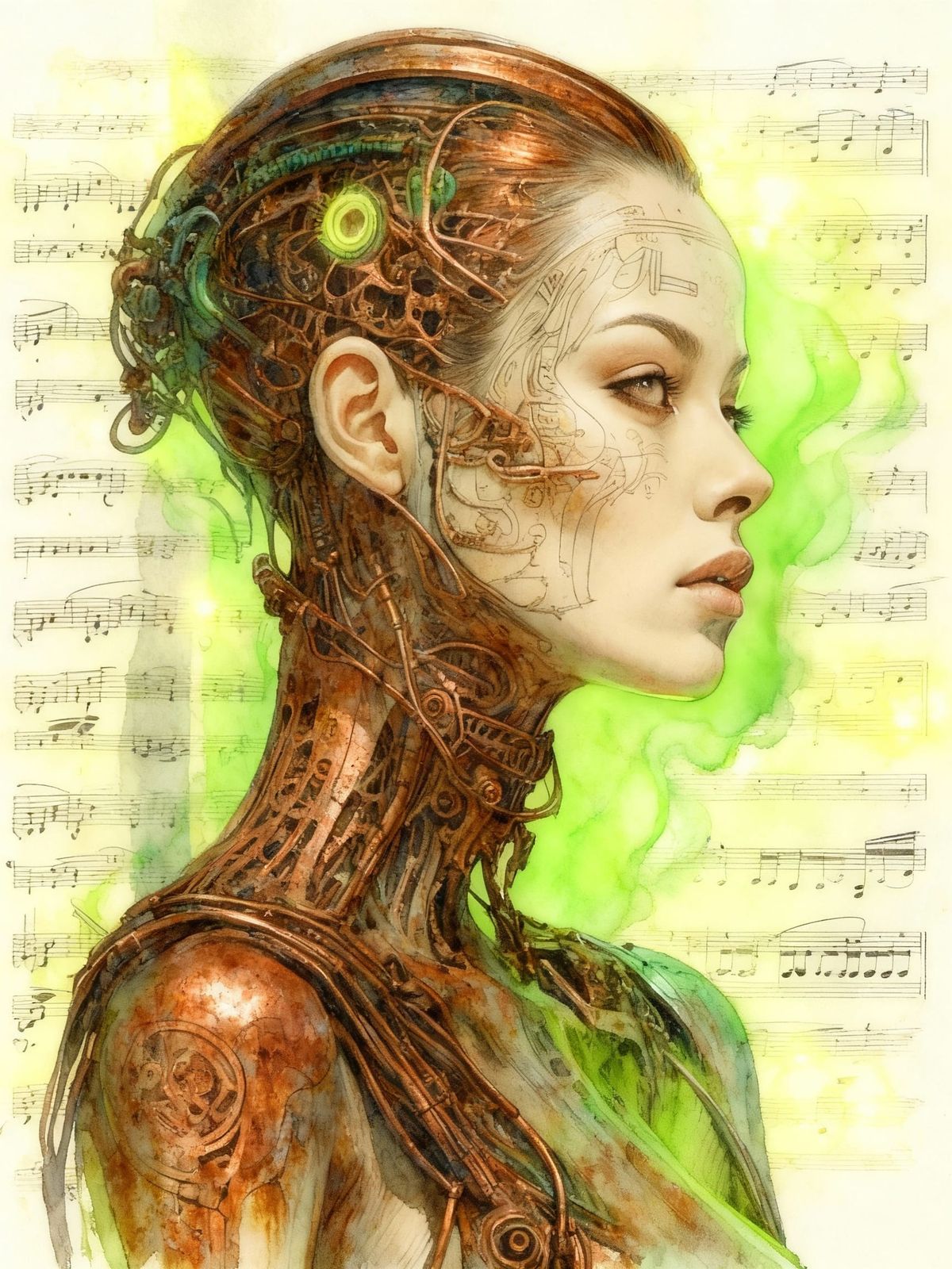 A limited-palette water-colour of a corroded-biomechanical cyborg woman (elaborate tarnished-copper exoskeletal lattice; interlaced hair and wiring; etched circuit patterns and musical notation); standing against a glowing backdrop of complicated sheet music and bright green vapour. Intricate details; ...