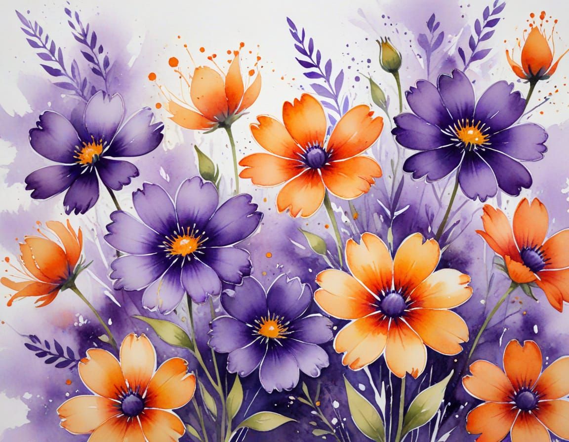 This image shows a close-up of purple and orange flowers. The watercolor splash art features expressive ink blooms and vibrant petals with a soft focus background in pastel colors.