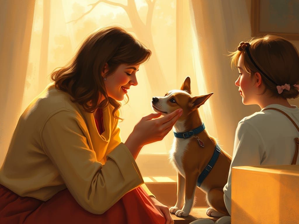 This image captures moments of empathy and generosity between people and animals, bathed in soft, warm light. Rendered with evocative brushstrokes, it celebrates connection and compassion.