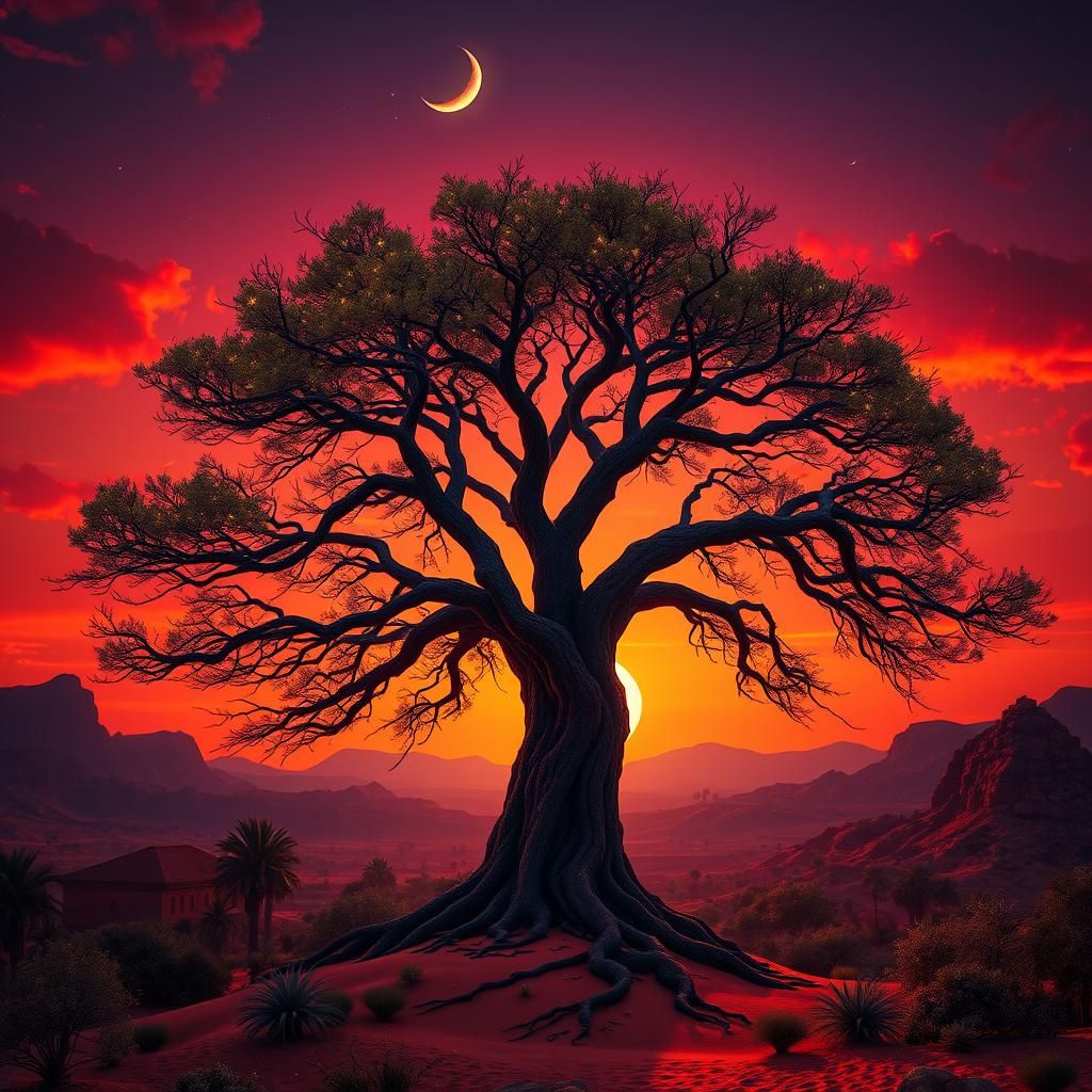 A digital matte painting of a tree of life under a twilight sky. The Moroccan-inspired landscape features a violet and reddish-orange backdrop with complementary colors and intricate details, in a high-fantasy style.