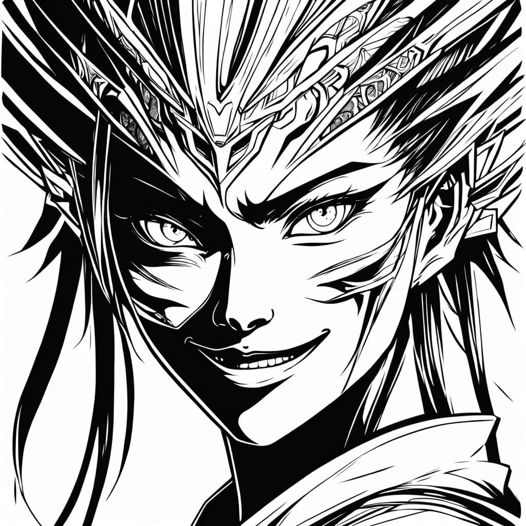 This image shows a close-up of an Oni woman's face, smiling. The art is black and white line art with gradient shading, showcasing expressive features in a manga style graphic illustration.