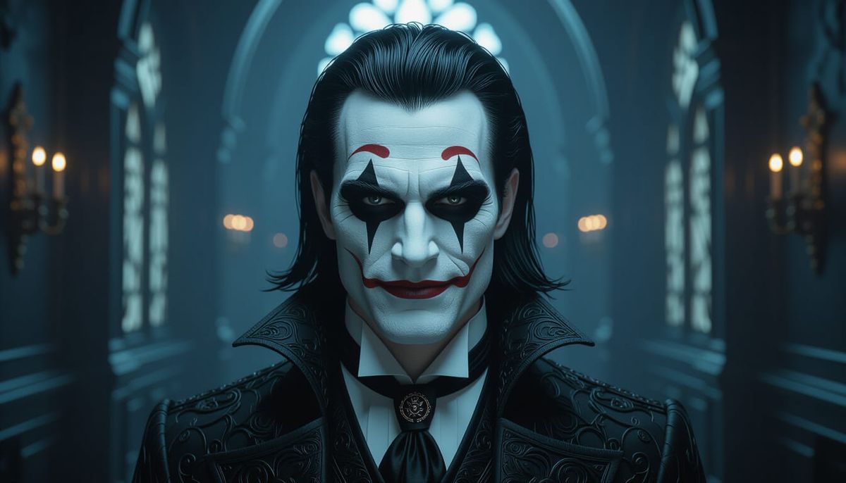 A striking picture of a man in gothic clothing with dramatic makeup, standing in a dimly lit hallway. The portrait features intricate details, hyperrealism and ornate flair, rendered with volumetric lighting in triadic colors.