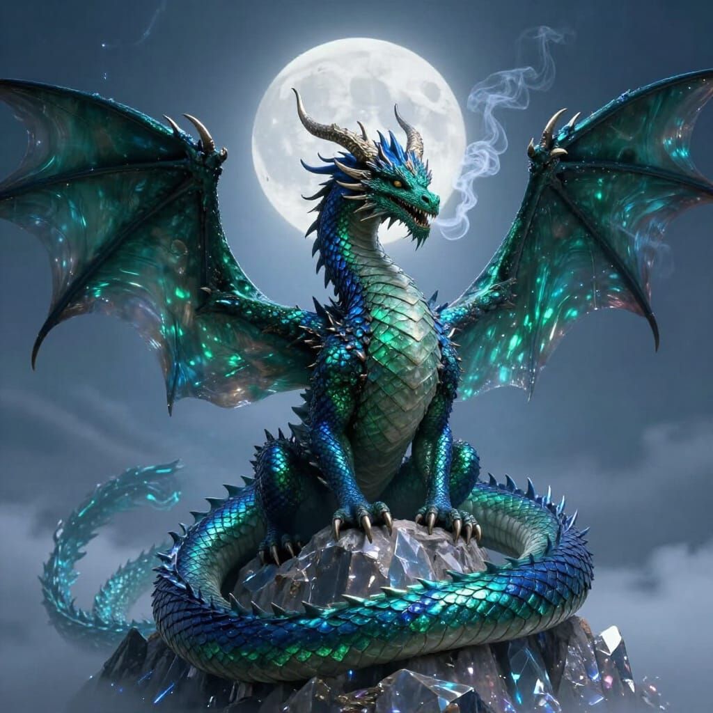 This photorealistic image shows a detailed, majestic dragon with emerald and sapphire scales coiled around a crystal mountain peak, wings unfurled under a twin moonlit sky. Cinematic lighting enhances its powerful presence.