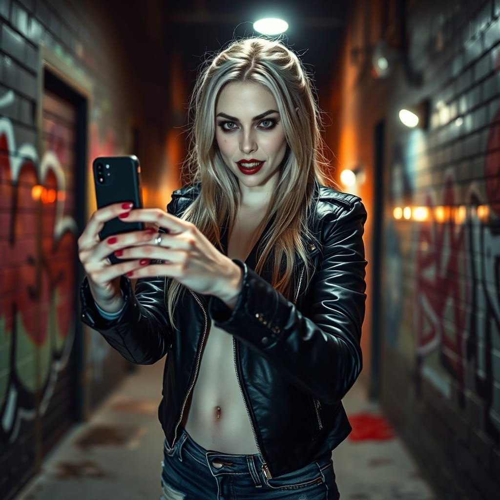This image shows a modern take on vampire lore, with a beautiful blonde teenager posing for a selfie while showcasing her sharp fangs in a contemporary setting.