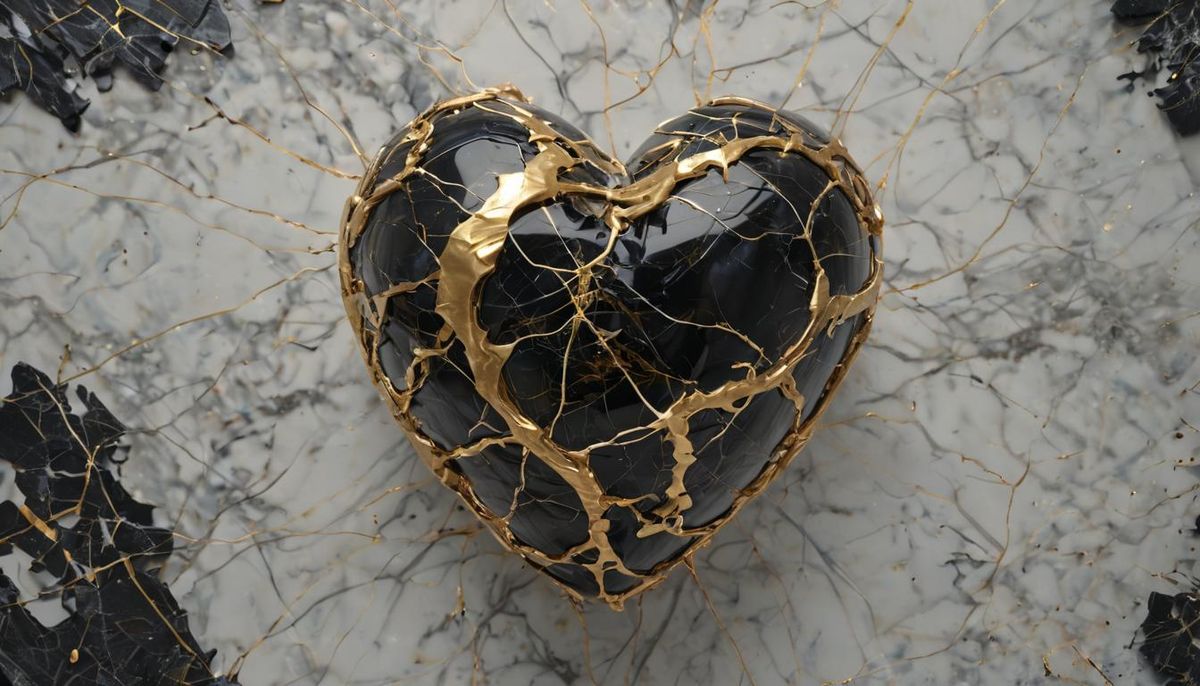 A mesmerizing image of a shattered black marble heart, mended with gold using the Japanese art of kintsugi. The statue is set against a gothic temple backdrop with fantasy elements.
