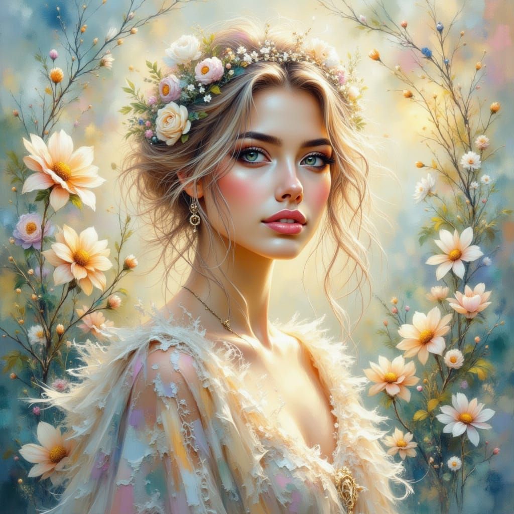 This hyperrealistic image features a full-body woman in a soft, graceful pose within a pastel landscape. The artwork blends oil and watercolor with grunge details, creating a serene yet textured visual.