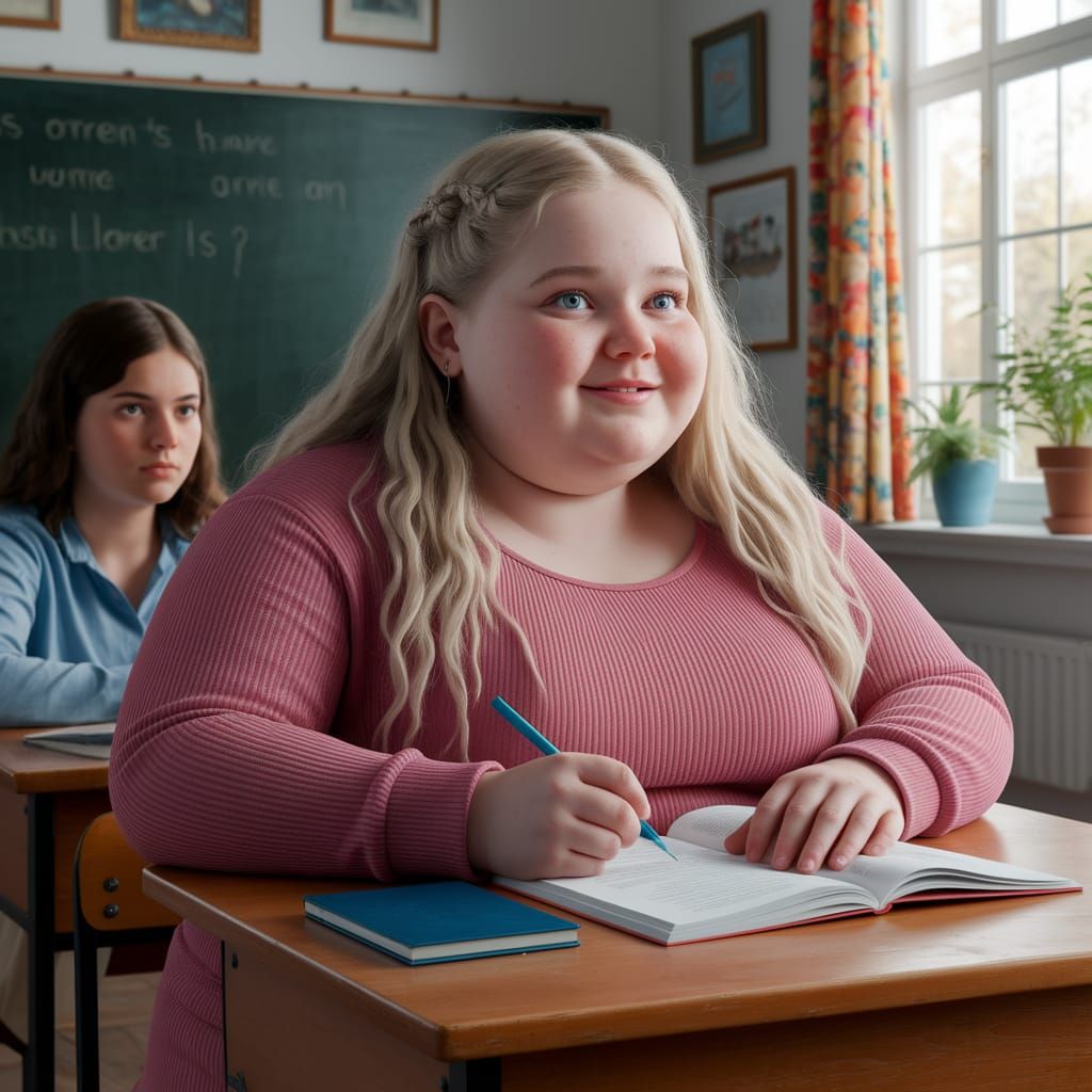 A hyperrealistic painting of a young French girl with a warm smile, studying in a colorful classroom. The artwork combines dramatic lighting with intricate details and a 2/3 face angle, creating a captivating scene.