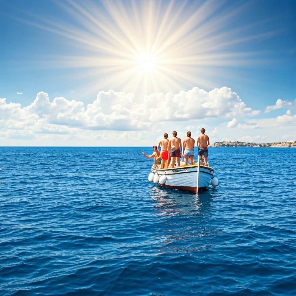 This image shows a group of shirtless men enjoying a regatta boat near the Amalfi coast. The scene is bathed in heavenly sunshine, creating a divine and bright atmosphere.
