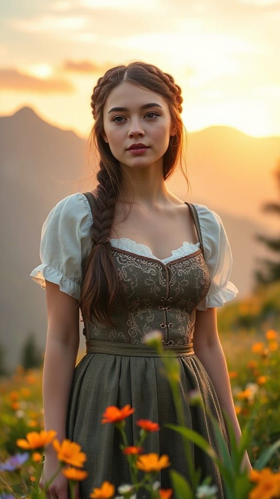 This image shows a serene young woman standing in a picturesque alpine meadow, surrounded by warm light and vibrant wildflowers, with intricate details in her embroidered dirndl and braided crown, set against a soft, pastel-toned sky.