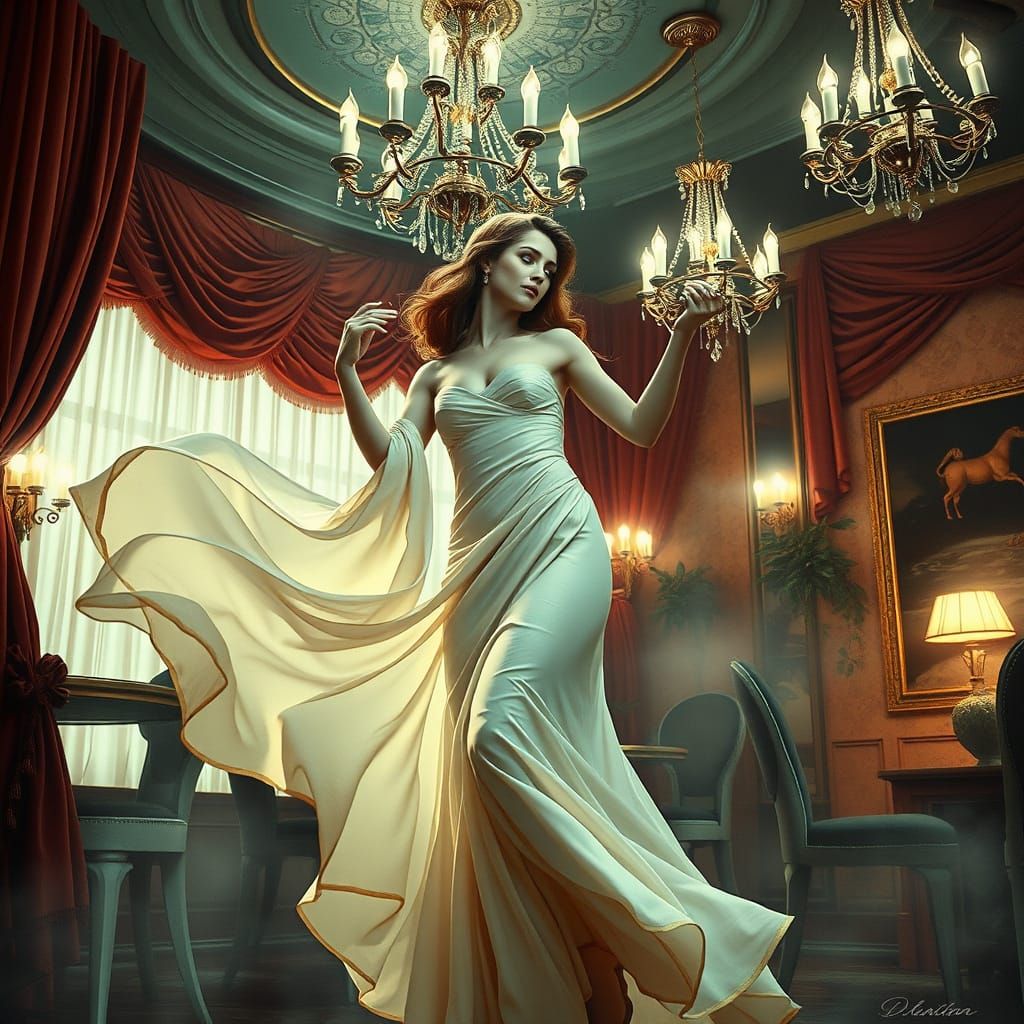 This image shows Aphrodite in an art-deco dress dancing in a retro club. The scene is rendered in a low-contrast, monochrome pastel watercolor style with cinematic lighting, resembling digital matte paintings.