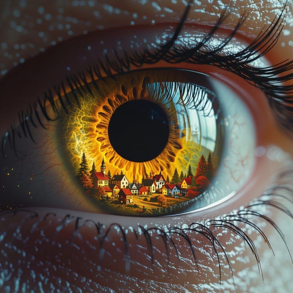 This surreal image features a human eye with an alien hand visible within its iris. The alien's palm holds a miniature autumn village.