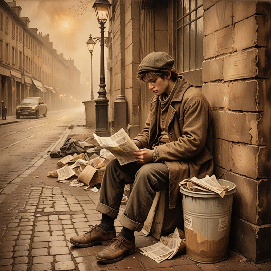 This image shows a homeless boy reading a newspaper next to a trash can. The scene evokes 18th-century scenery and is depicted with warm golden lighting, soft watercolor textures, and a sepia color scheme, in an oil painting style.