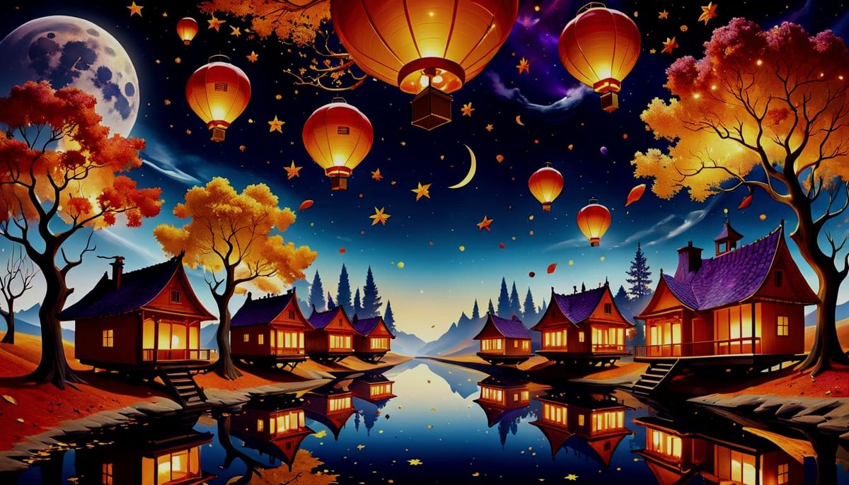 "3D nighttime surrealism autumn season floating upside down tons of floating leaved winged cabins in the sky using colors of Red Orange gold...