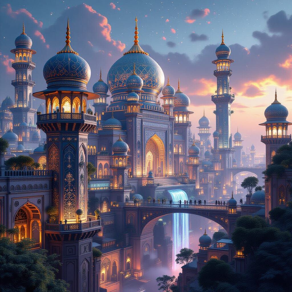 A fantastical cityscape inspired by the tales of 1001 Arabian Nights, where towering Moghul palaces and gilded domes shimmer with intricate geometric motifs, fractal arabesques, and delicate filigree embellishments. The metropolis glows with a dreamlike radiance, as if conjured by djinn, its towers wrapped in bioluminescent vines that illuminate the arches and minarets in hues of sapphire, emerald, and gold. Lanterns float like stars above winding streets, while jeweled mosaics and surreal ornamentation reflect an atmosphere of mystery and wonder. The scene is rendered in breathtaking detail, captured from a sweeping wide-angle view, enhanced with soft mist, chromatic shimmer, and luminous, enchanted light.