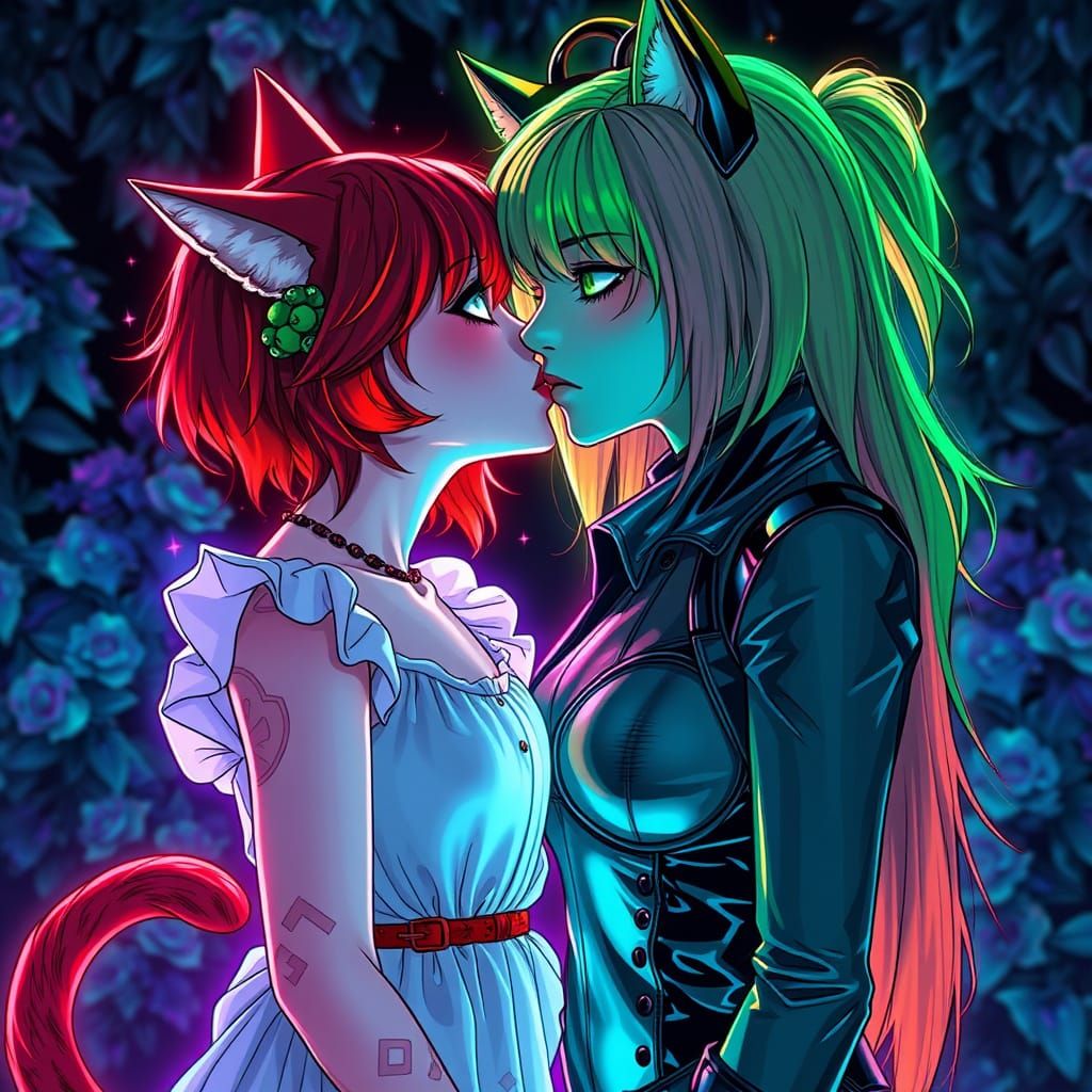 This vibrant image captures a tender moment between two women in a glowing garden, blending cute and punk rock elements with intricate details and dynamic lighting.