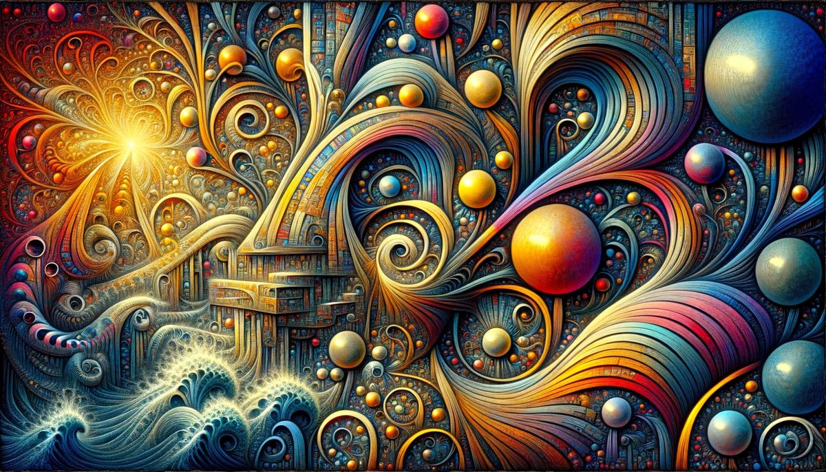A surreal image with mathematically precise designs. The artwork contains surrealistic details and a dreamy, lo-fi aesthetic. Vibrant colors contrast with stark black and white in this graphic novel style image.