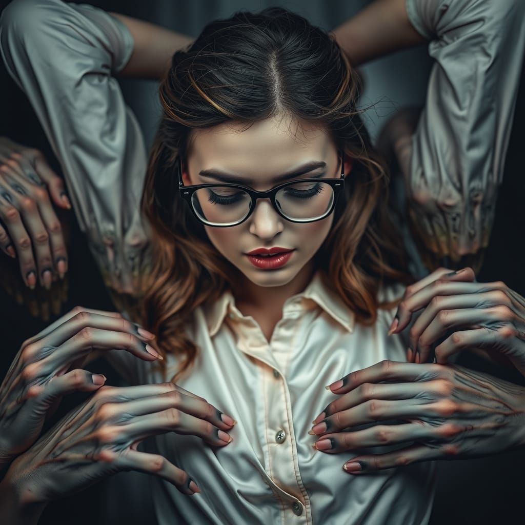 This image shows a close-up of a frightened woman in a dreamy white silk shirt, surrounded by eerie and menacing ghouls with long fingers. The scene is ethereal and unsettling, capturing a moment of terror and vulnerability.