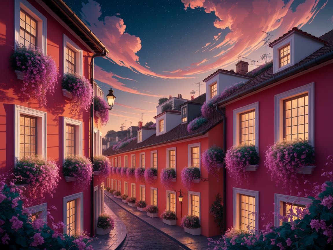 A vivid image of a historic urban district illuminated by golden light. The scene features glowing facades, rooftop gardens, and cobblestone streets under a swirling night sky, all rendered as dreamlike digital art.