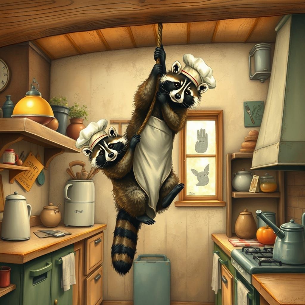 A charming image of raccoons dressed as chefs descending a rope in a kitchen. The illustration is in a whimsical style with rustic decor, warm lighting and a pastel color palette.