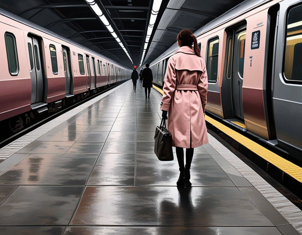 A neo-impressionistic painting of a woman in a pink coat walking toward a train in the Tokyo subway. The artwork uses muted colors and smooth impasto techniques to create a vibrant and detailed urban scene.