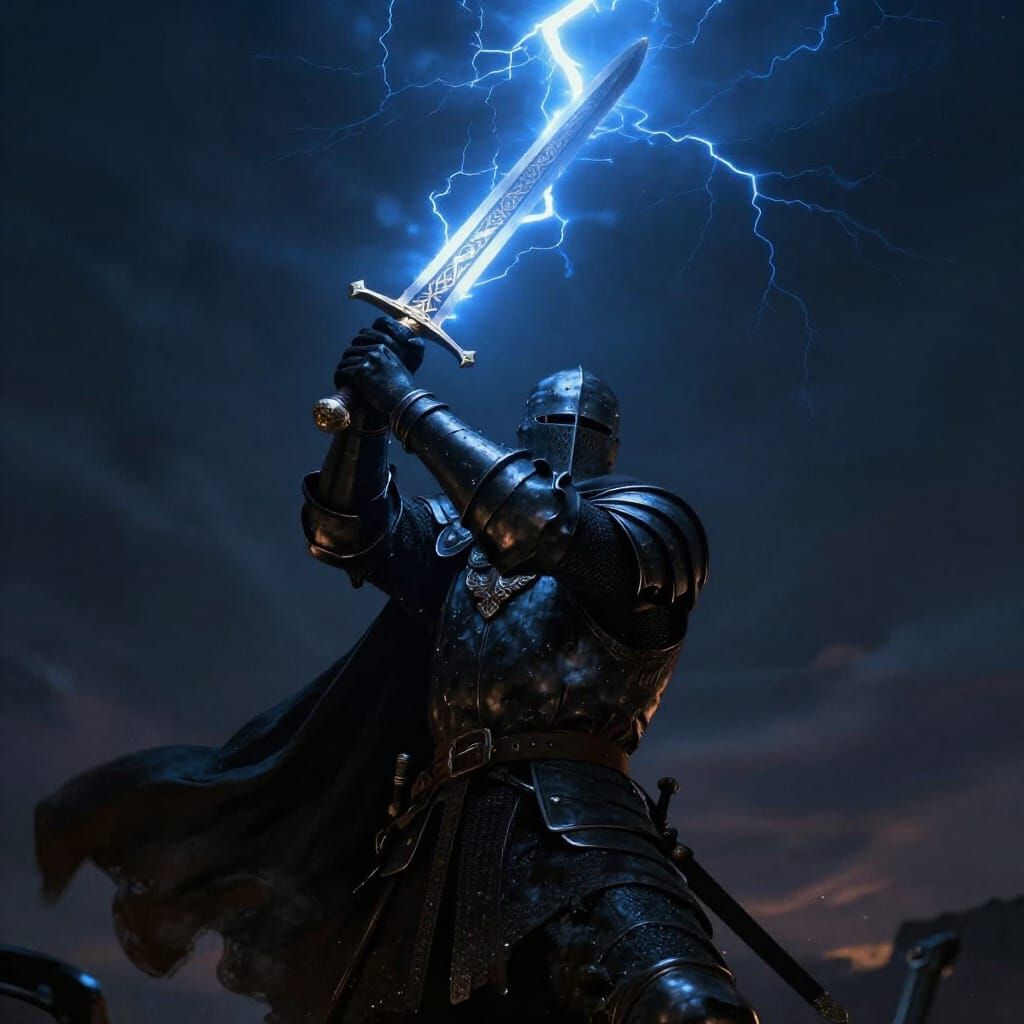 A realistic image of a medieval warrior holding a glowing greatsword as lightning strikes it. The scene features dramatic lighting and an epic, powerful atmosphere, evoking a painterly battle style.