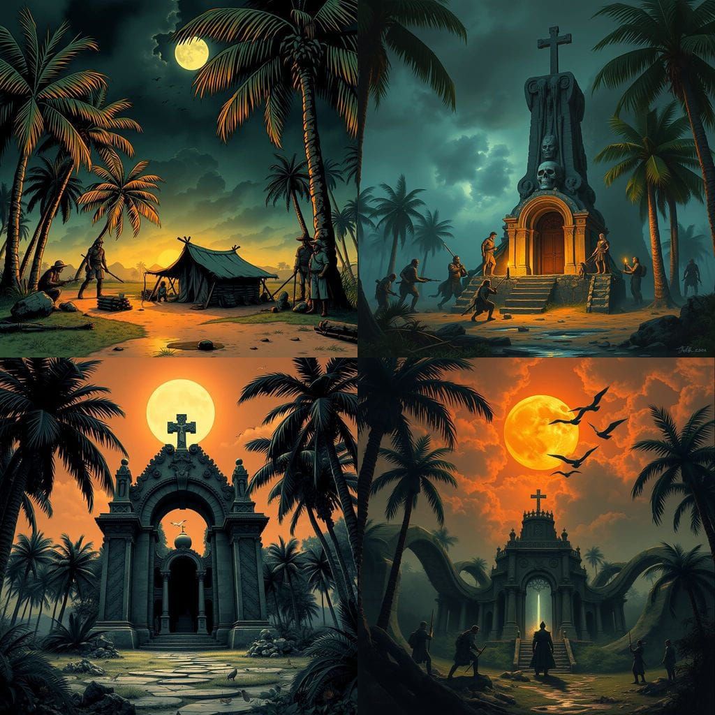 A striking picture of a makeshift graveyard in an alternate colonial Brazil. The scene features indigenous warriors, shamans, and peasants observing a burial at sunset with a dark, realistic comic book aesthetic.