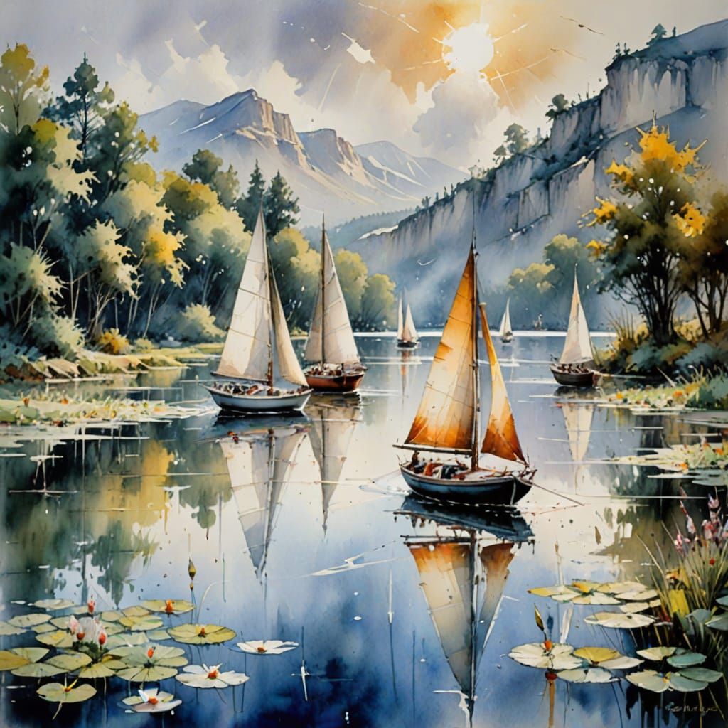 Easily generate sailing boat images on a lake with our free AI image generator, inspired by watercolor art styles