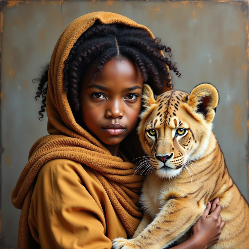 <lora:Minamax:1.0> Digital art. Line art mixed with watercolor. Art by hieronymus bosch. A little african girl in textured robes and Lion Cub. sharp focus, studio photo, intricate details, highly detailed, impressionist lighting, dynamic poses, light on faces, shadow play, perfect faces, sharp eyes ...